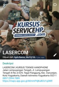 Waktu kursus yang singkat dan dipandu oleh trainer handal dengan segudang pengalaman namun tetap easy going menjadikan peserta nyaman belajar di Lasercom. Mendapat bonus database software, akses ke suplier sparepart bahkan mendapatkan support life time dan konsultasi gratis. Tidak lupa pula dibekali ilmu enterpreneur bagi peserta yang ingin membuka usaha sendiri pasca kursus. Tunggu apalagi, mari daftarkan diri untuk kursus di kursusservicehp.com, perlu diingat kami tidak buka kelas setiap hari melainkan ada jadwalnya yang bisa kalian cek di kursusservicehp.com/jadwalkursus . Lasercom Training Center sudah tersebar di seluruh Indonesia dari KURSUS SERVICE HP JOGJA, KURSUS SERVICE HP MAGELANG, KURSUS SERVICE HP PURWOREJO, KURSUS SERVICE HP MALANG, KURSUS SERVICE HP SIDOARJO, KURSUS SERVICE HP BEKASI, KURSUS SERVICE HP BANDUNG, KURSUS SERVICE HP MANADO, KURSUS SERVICE HP MERAUKE, KURSUS SERVICE HP MADURA, KURSUS SERVICE HP MURAH. Dengan biaya yang murah kalian bisa dibimbing menjadi teknisi handphone handal. Untuk informasi seputar service handphone dan laptop kalian bisa cek di lasercom.co.id.